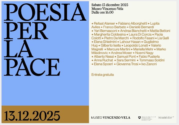Un «fuori programma» al Museo Vincenzo Vela, che si svolgerà sabato 13 dicembre dalle ore 16.00: «Poesia per la pace», un appuntamento corale che riunisce oltre trenta poeti e poetesse – in persona o presenti attraverso le loro parole – di generazioni diverse, provenienti soprattutto dalla Svizzera italiana, ma anche da altri orizzonti culturali. Una serata in cui le voci si intrecciano per esprimere solidarietà verso chi vive la guerra, per ricordare che i conflitti sono realtà ancora presenti e dolorose.